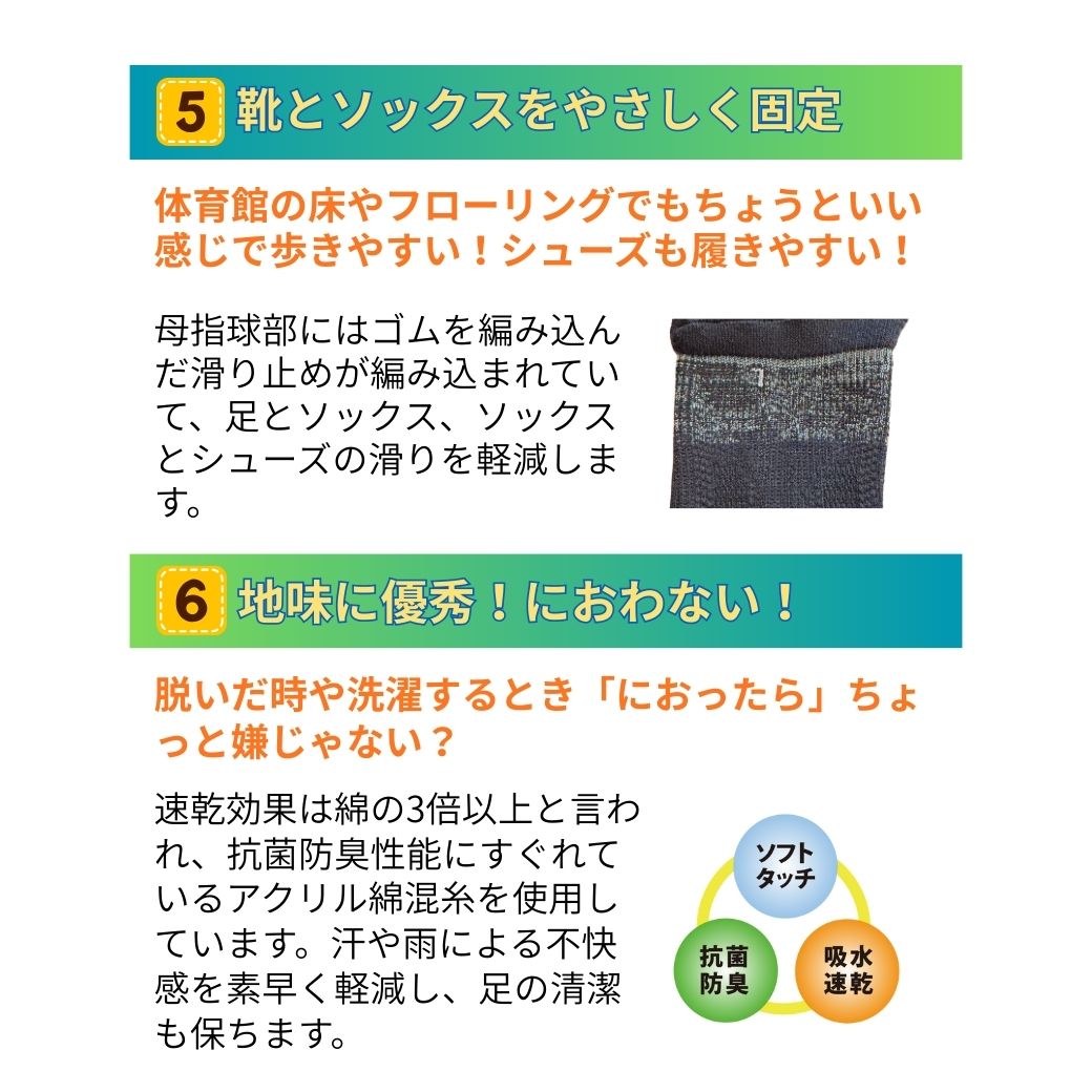 母指球部にゴム糸を編み込み、シューズ内やフローリングでの滑りを軽減。体育館競技にも日常にも対応。